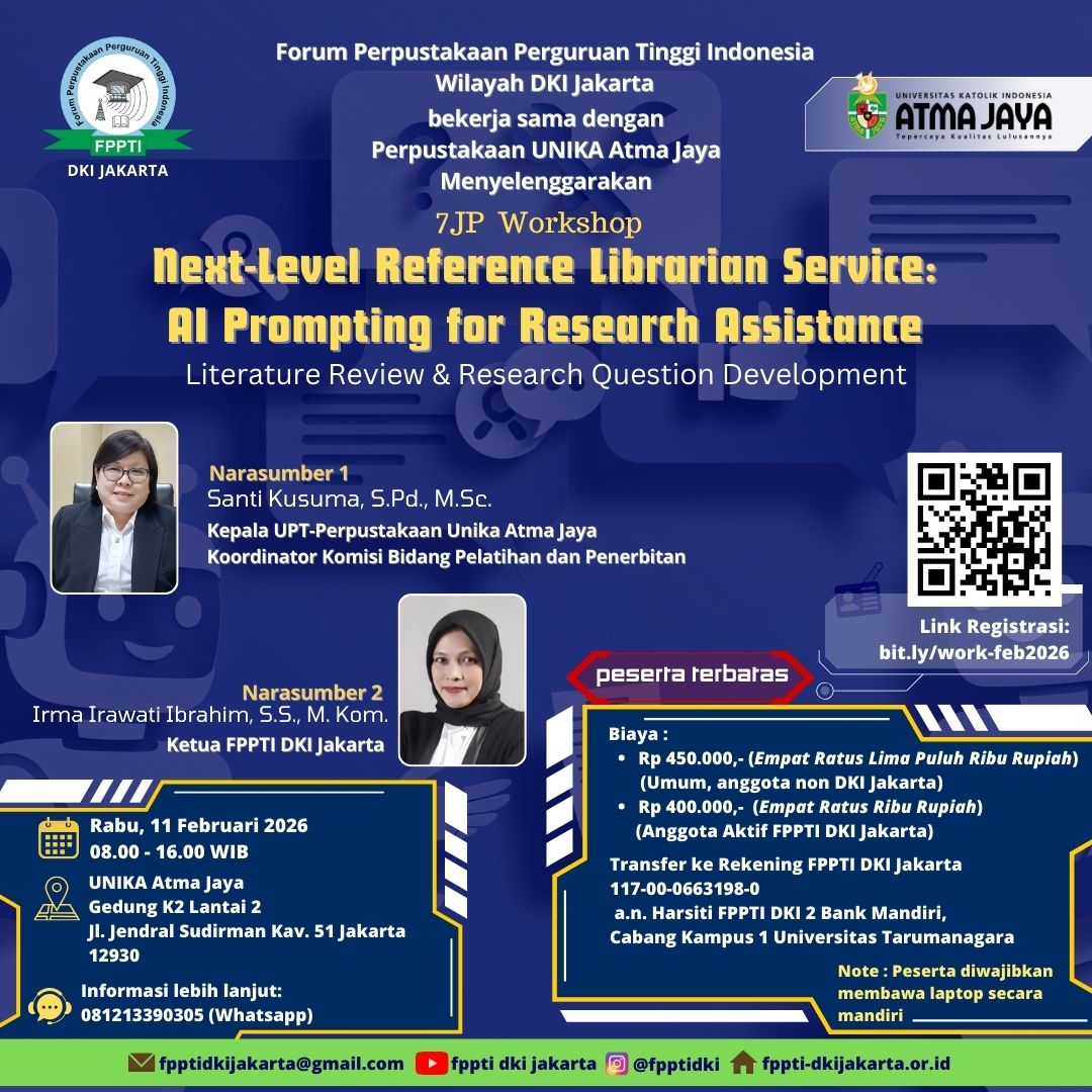 Oleh karena itu, Forum Perpustakaan Perguruan Tinggi (FPPTI) DKI Jakarta memandang perlu menyelenggarakan seminar dan pelatihan bertema “Next-Level Reference Librarian Service: AI Prompting for Research Assistance - Literature Review & Research Question Development” sebagai upaya peningkatan literasi AI dan kompetensi riset untuk membekali pustakawan, khususnya pustakawan layanan referensi, dengan kemampuan praktis dalam menyusun prompt AI yang efektif untuk membantu pemustaka dalam menyusun literature review dan merumuskan research question yang lebih tajam, fokus, dan sesuai kaidah ilmiah. Serta memperkuat pemahaman pustakawan mengenai perannya dalam ekosistem penelitian di perguruan tinggi.